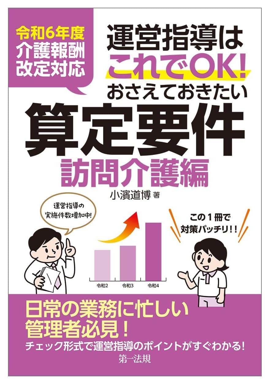 訪問介護事業所に対して行われる「運営指導」で、事業所の指定取消などの行政処分につながるような運営基準の誤り、報酬の返還につながるような算定要件の誤りを起こさないための、主に事業所の管理者向けの解説書。令和6年4月の報酬改定に対応。