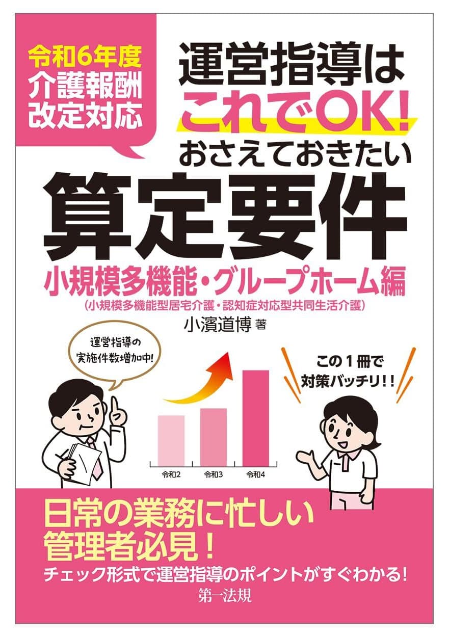 小規模多機能型居宅介護、認知症対応型共同生活介護を提供する事業所に対して行われる「実地指導」で、事業所の指定取消などの行政処分につながるような誤りを起こさないための、主に事業所の管理者向けの解説書。令和6年4月の報酬改定に対応。
